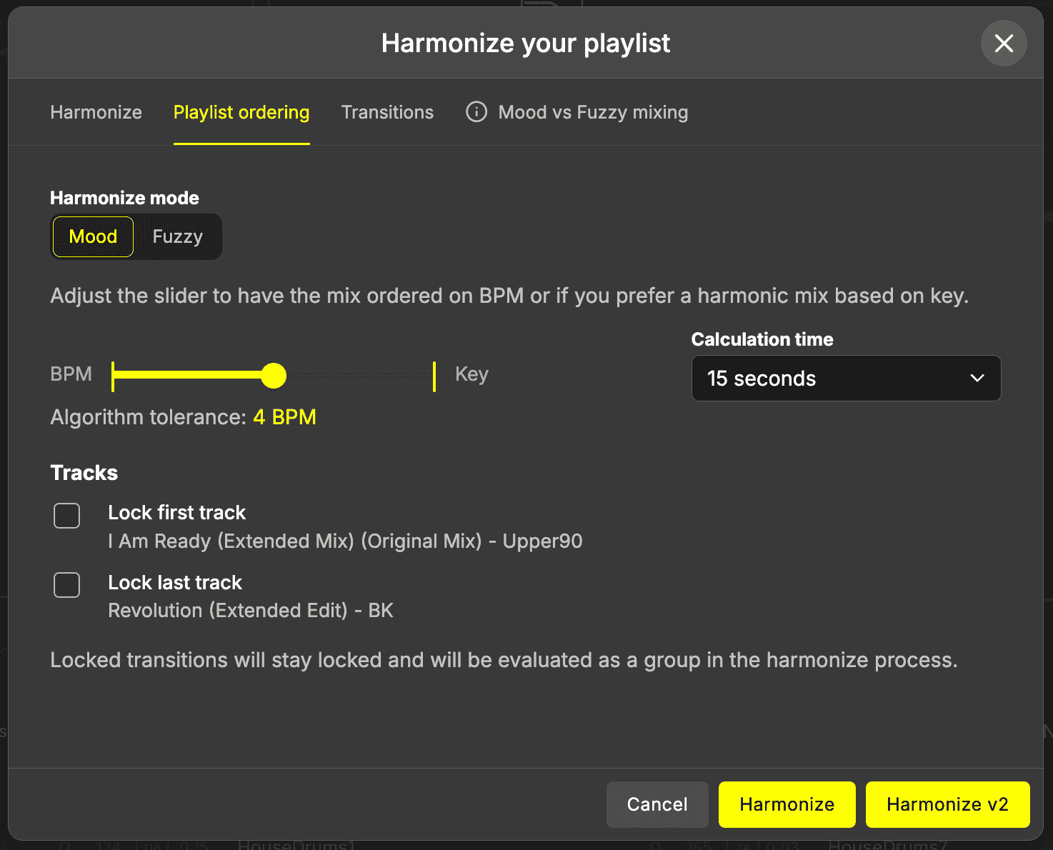 • Lock first track:  if you have already decided which track you want to start your mix with, make sure the track is the first song in your mix. Check this box to make sure Harmonize will start with this track.