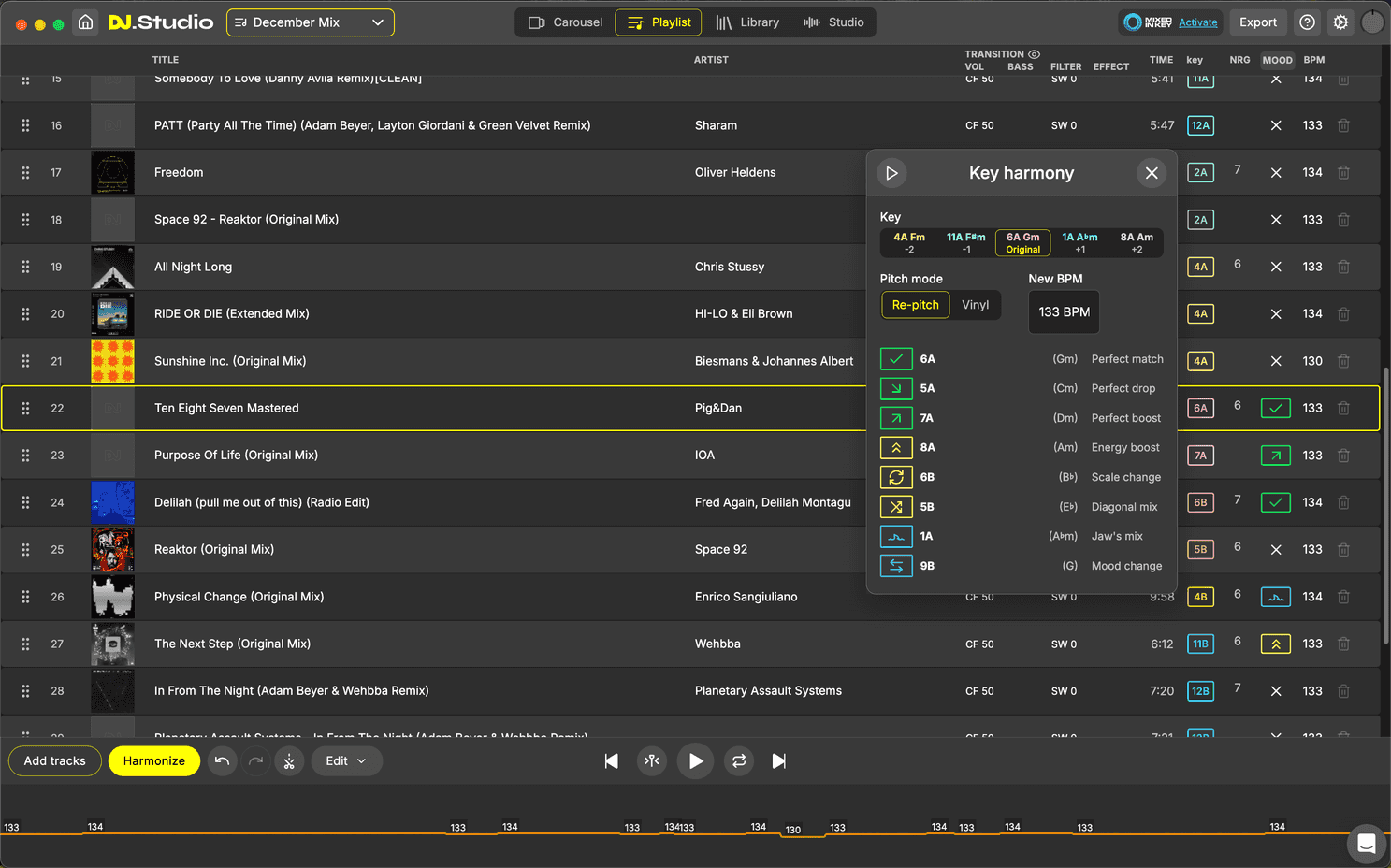 The Harmonize in DJ Studio will give you the best order of tracks so that the sounds of the songs will clash the least as possible.