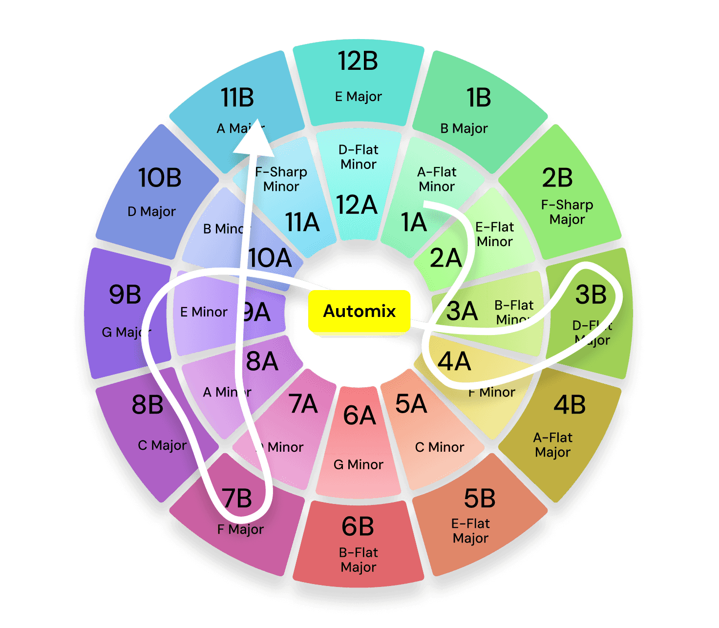 Switch between the inner and outer rings: A track in 8A (A Minor) is a perfect relative match for 8B (C Major).