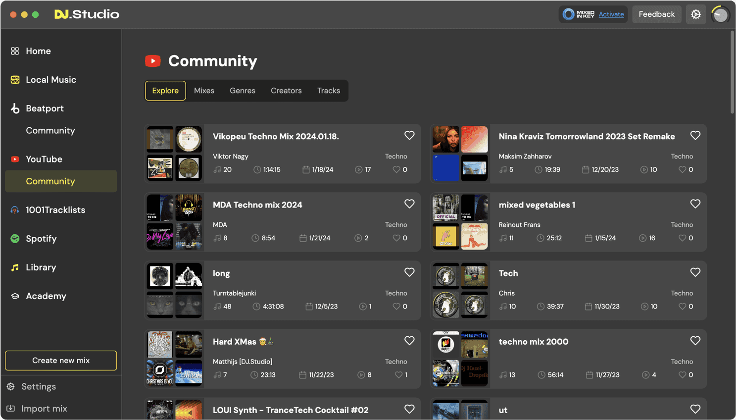 Another neat way to discover new music is by checking out the community mix page. You can browse thousands of mixes made by the community and pick through their tracklists. If you find tracks that you like in a mix, simply hit the ‘Favorite’ button to save it to your library. Then you can quickly add them to your own mix