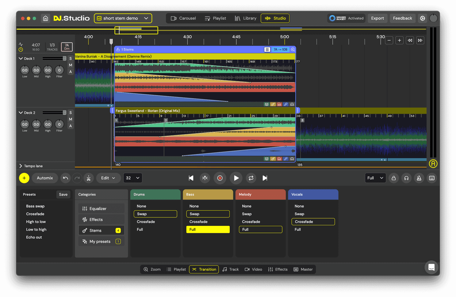 The Benefit for Your Mix: This feature gives you ultimate creative freedom. You can design unique and complex transitions that define your signature sound. Whether you prefer long, smooth blends or sharp, energetic cuts, DJ.Studio provides the tools to execute them perfectly.