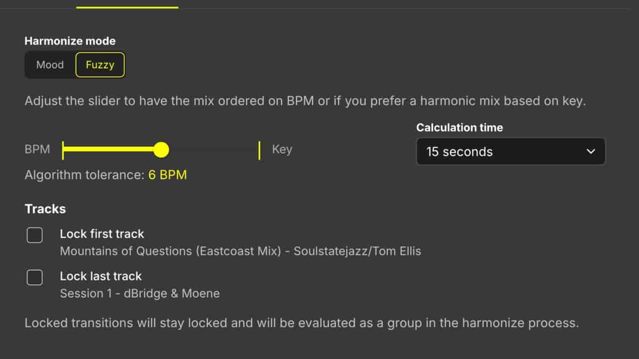 Click Harmonize - DJ.Studio analyzes the BPM and key of every track in your playlist and intelligently reorders your set based on your chosen balance between tempo and harmonic compatibility. You can fine-tune the result using Mood or Fuzzy mixing, set BPM tolerance, lock your opening or closing tracks, and control how strictly the algorithm follows BPM versus key. The result is a smoothly flowing, harmonically coherent DJ set without manual calculations or guesswork.