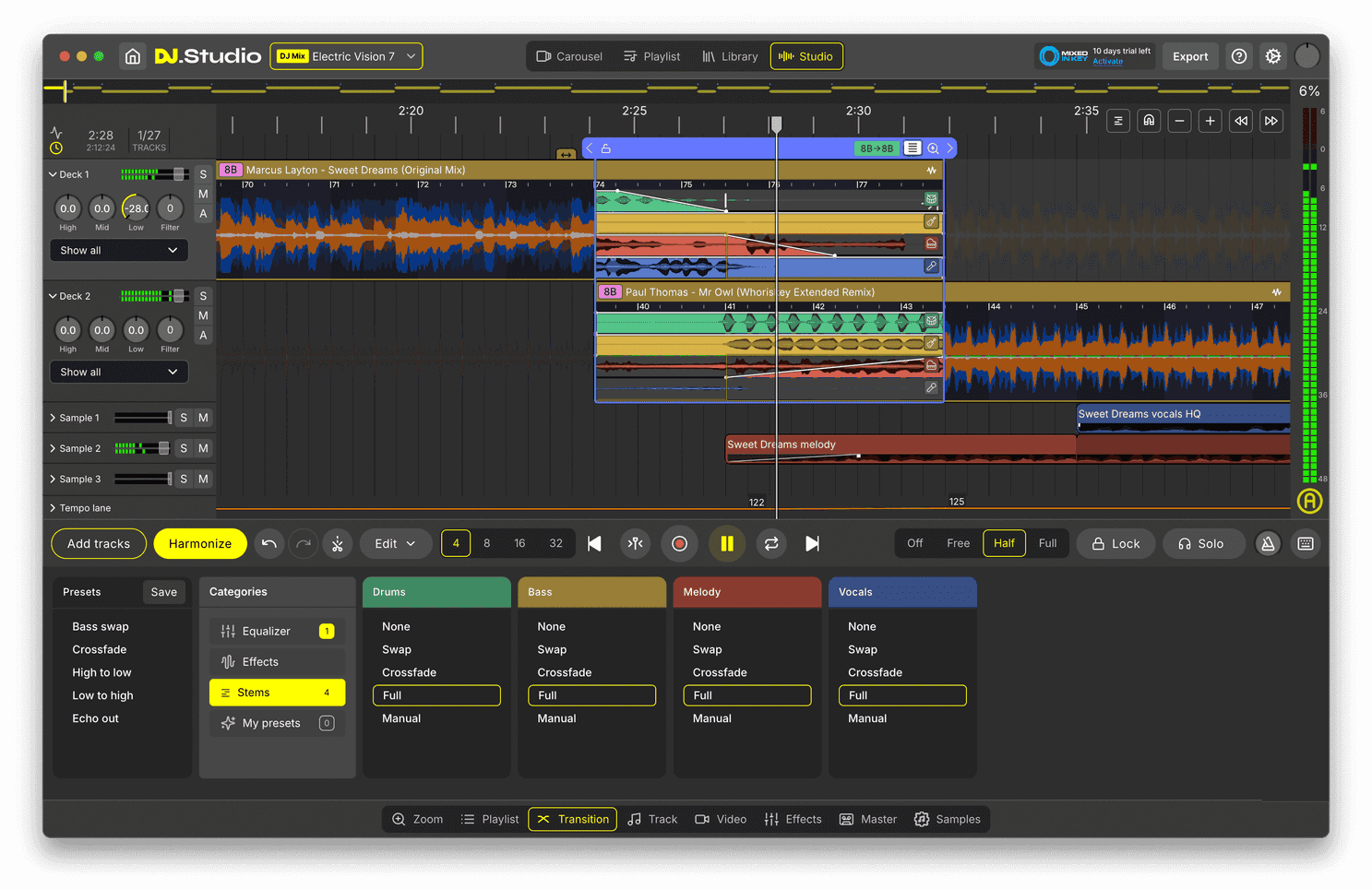Fine-tune your mix on the timeline. Adjust transitions, automate parameters, create loops, add samples, and make precise edits. You can use presets or build transitions manually, depending on your workflow.