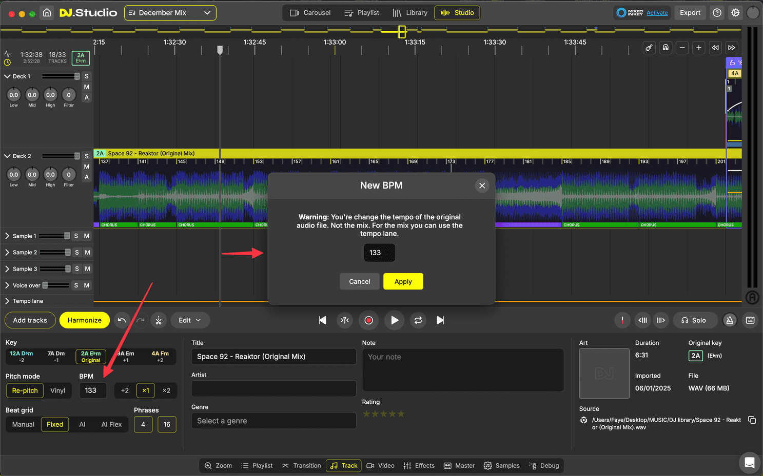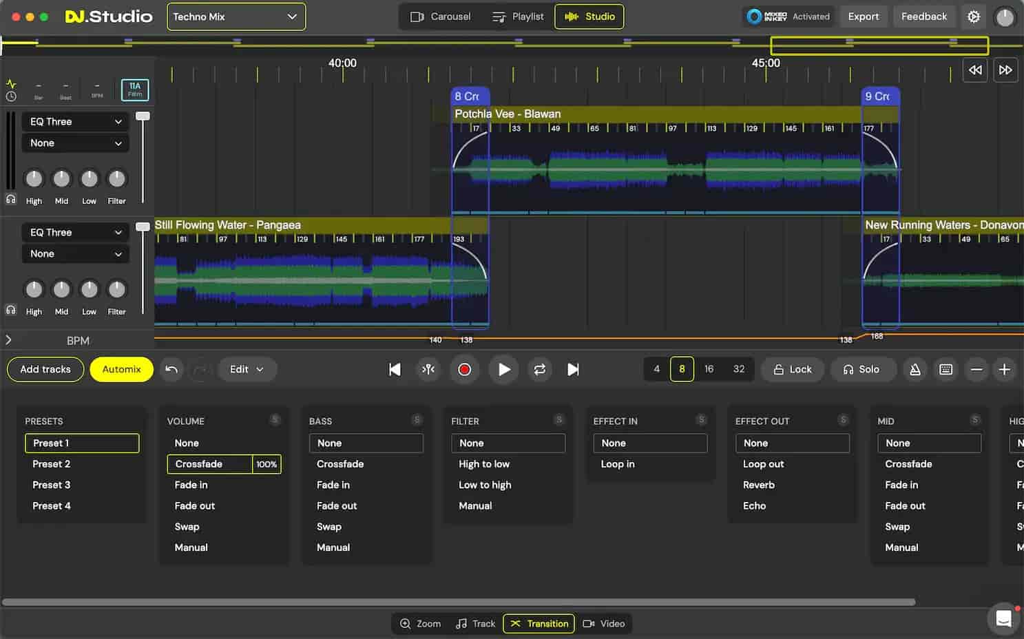 Automix - Use DJ.Studio's automix algorithm to instantly find the optimal order of your songs based on their key and tempo. DJ.Studio will then harmonically mix and beat-match all the songs in your library.