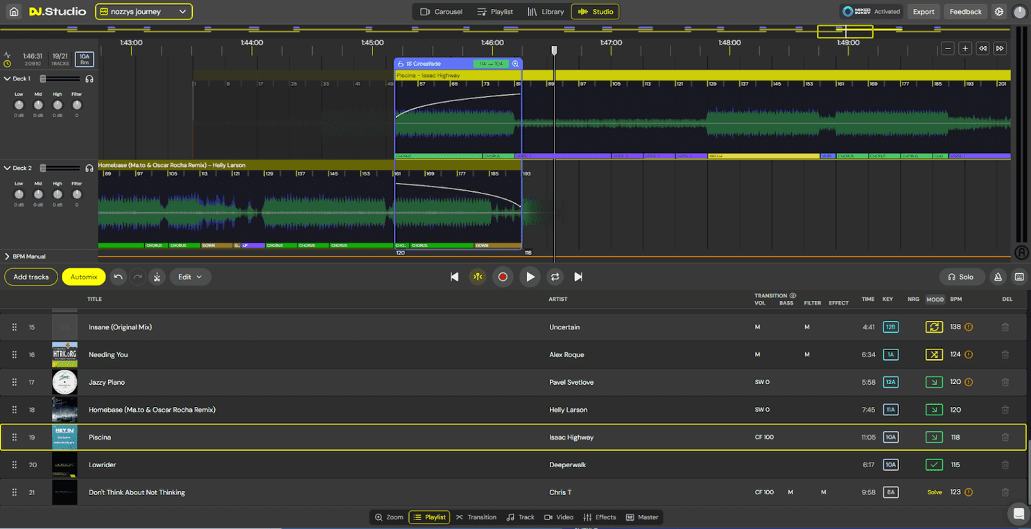 Professional Integration - Not only is it perfect for making mixes in the studio, but DJ.Studio is also a tool for DJs who mix on stage. It's connected with all major DJ software, letting you take advantage of the smart AI automixer, playlist suggestions, and transition preparation tools - which can then be exported as a prepared DJ set into your live software.