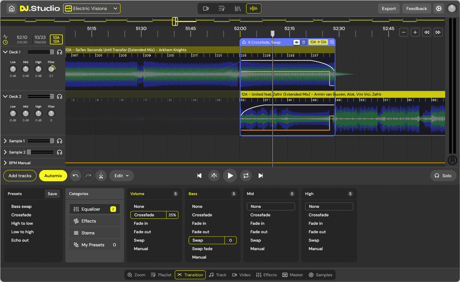 Use Case: You're trying to mix two tracks, but the basslines clash, creating a muddy sound. In the DJ.Studio editor, you can see exactly where the bass elements overlap. You simply draw a curve to automatically lower the bass EQ on the first track while the second track is mixing in, resulting in a clean, powerful, and professional-sounding transition.